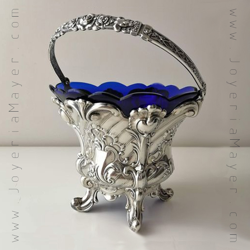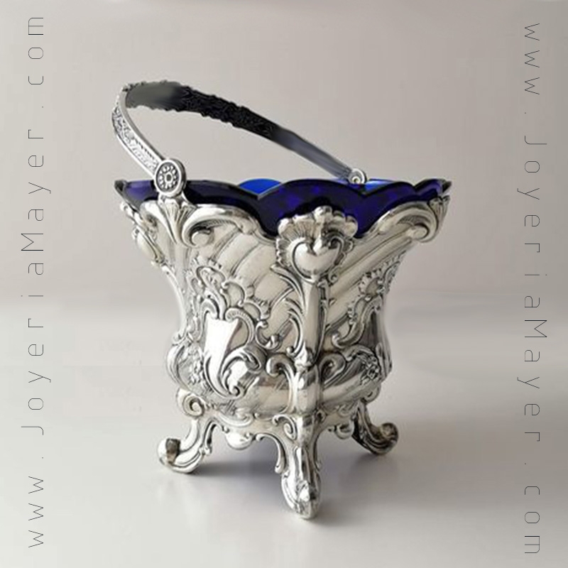 925 silver ice bucket, cobalt crystal inner container, classic embossing, mod. Louis XV silver ice bucket by Pedro Durán.