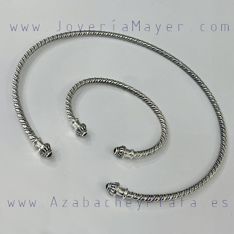 Collar torque celta de plata de ley 925 y azabache, abierto, adaptable a cualquier ancho, fabricado artesanalmente en nuestro taller, mod. torque collar celta de plata y azabache fino.