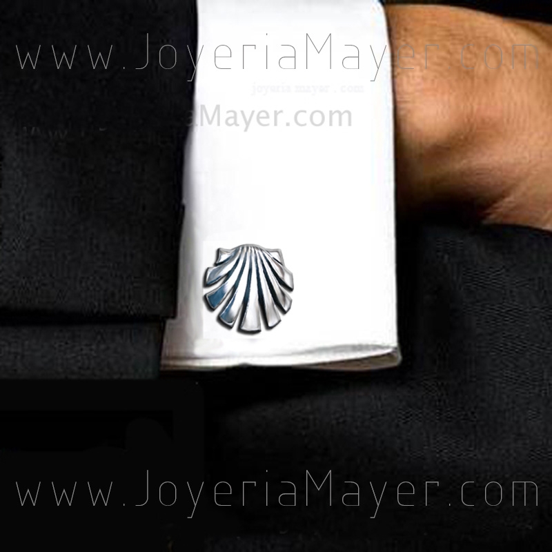 Gemelos de concha de plata de ley 925, cierre abatible, diseñado y fabricado en nuestro taller, mod. gemelos de plata concha de Compostela esbelta 1.