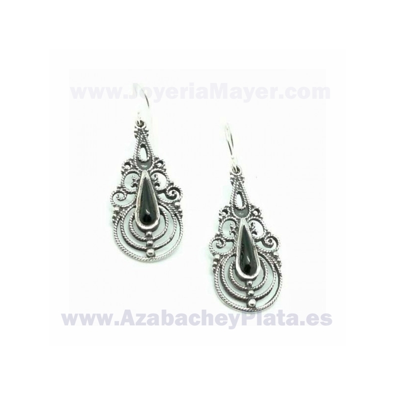 Pendientes de plata y azabache, cierre de gancho, mod. pendientes de plata y azabache gota de filigrana concéntrica.