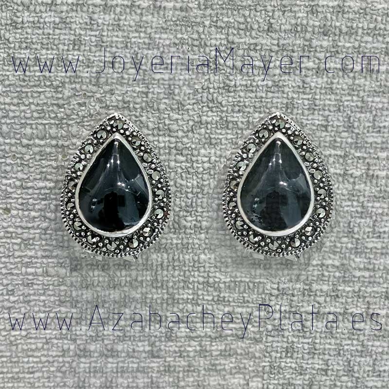 Pendientes de plata y azabache, con marcasitas, cierre clip omega, mod. pendientes de plata y azabache con marcasitas gota grande nvt.